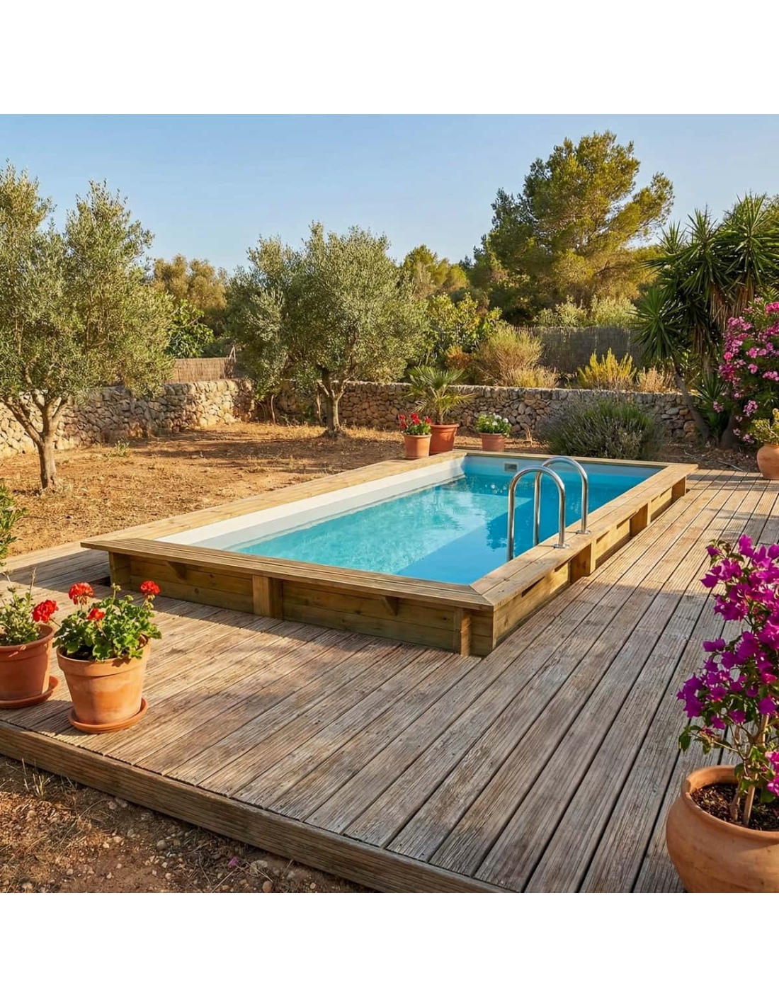 Holz verleiht der Umgebung einen eleganten und gemütlichen Charakter, und sein klassisches Erscheinungsbild sorgt dafür, dass sich der Pool harmonisch in jede Gartenart einfügt. Sie können Holzterrassen, Pflanzen oder dekorative Beleuchtung ergänzen, um eine besonders stimmungsvolle Atmosphäre zu schaffen.