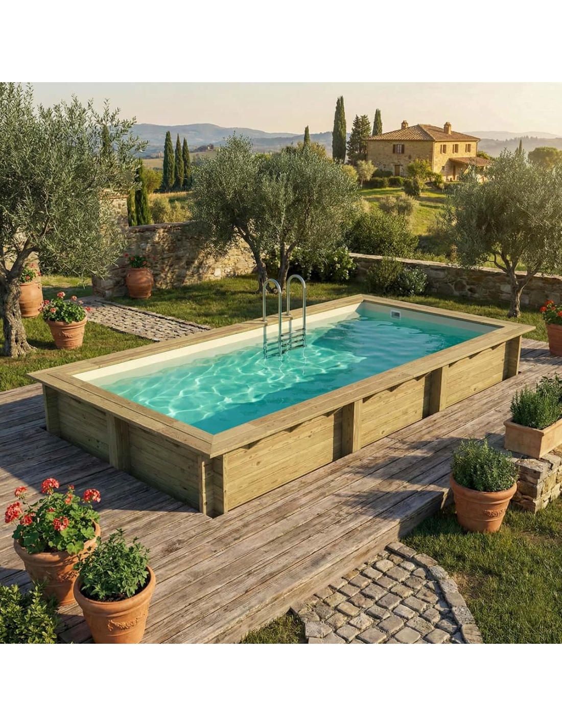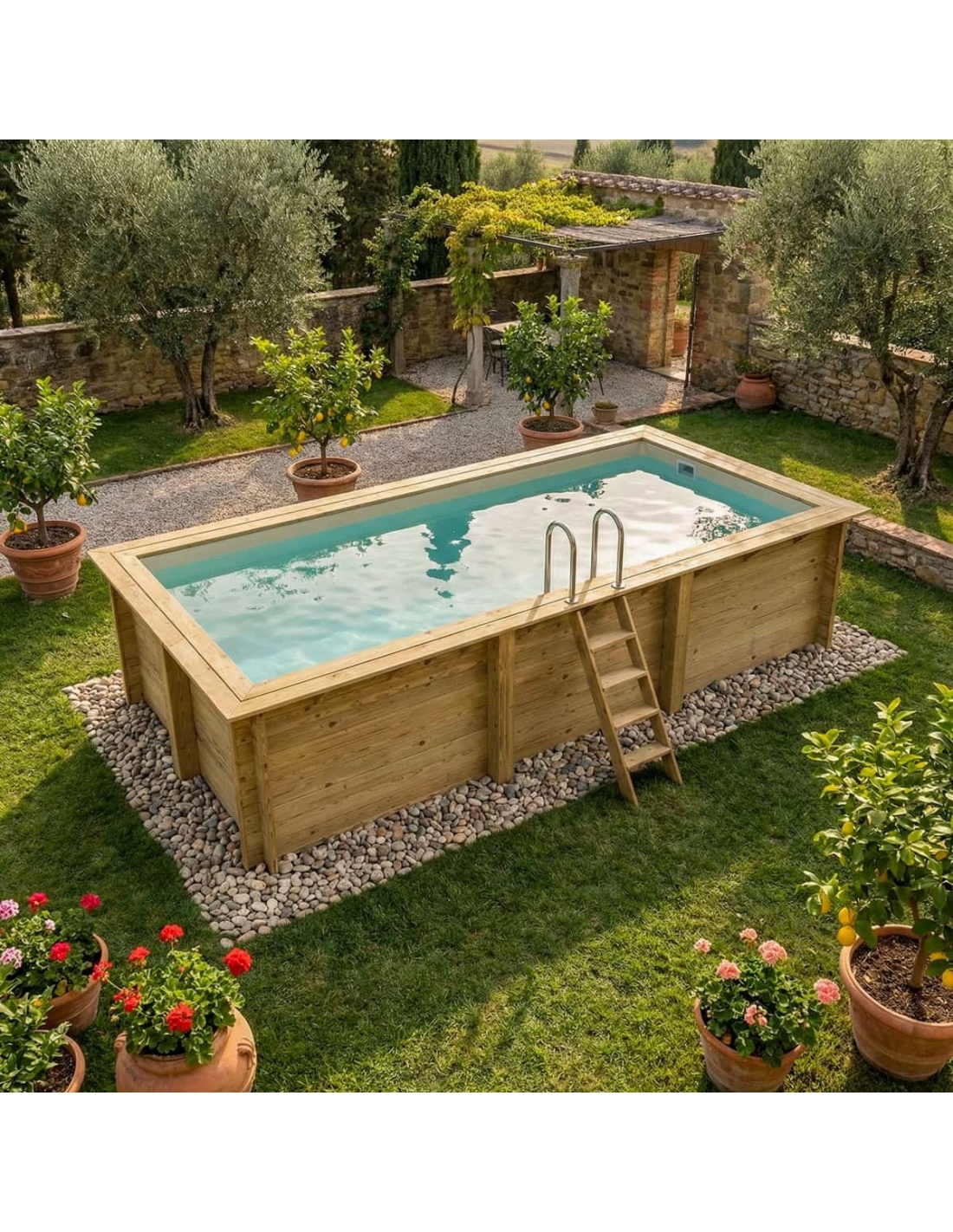 Holz verleiht der Umgebung einen eleganten und gemütlichen Charakter, und sein klassisches Erscheinungsbild sorgt dafür, dass sich der Pool harmonisch in jede Gartenart einfügt. Sie können Holzterrassen, Pflanzen oder dekorative Beleuchtung ergänzen, um eine besonders stimmungsvolle Atmosphäre zu schaffen.