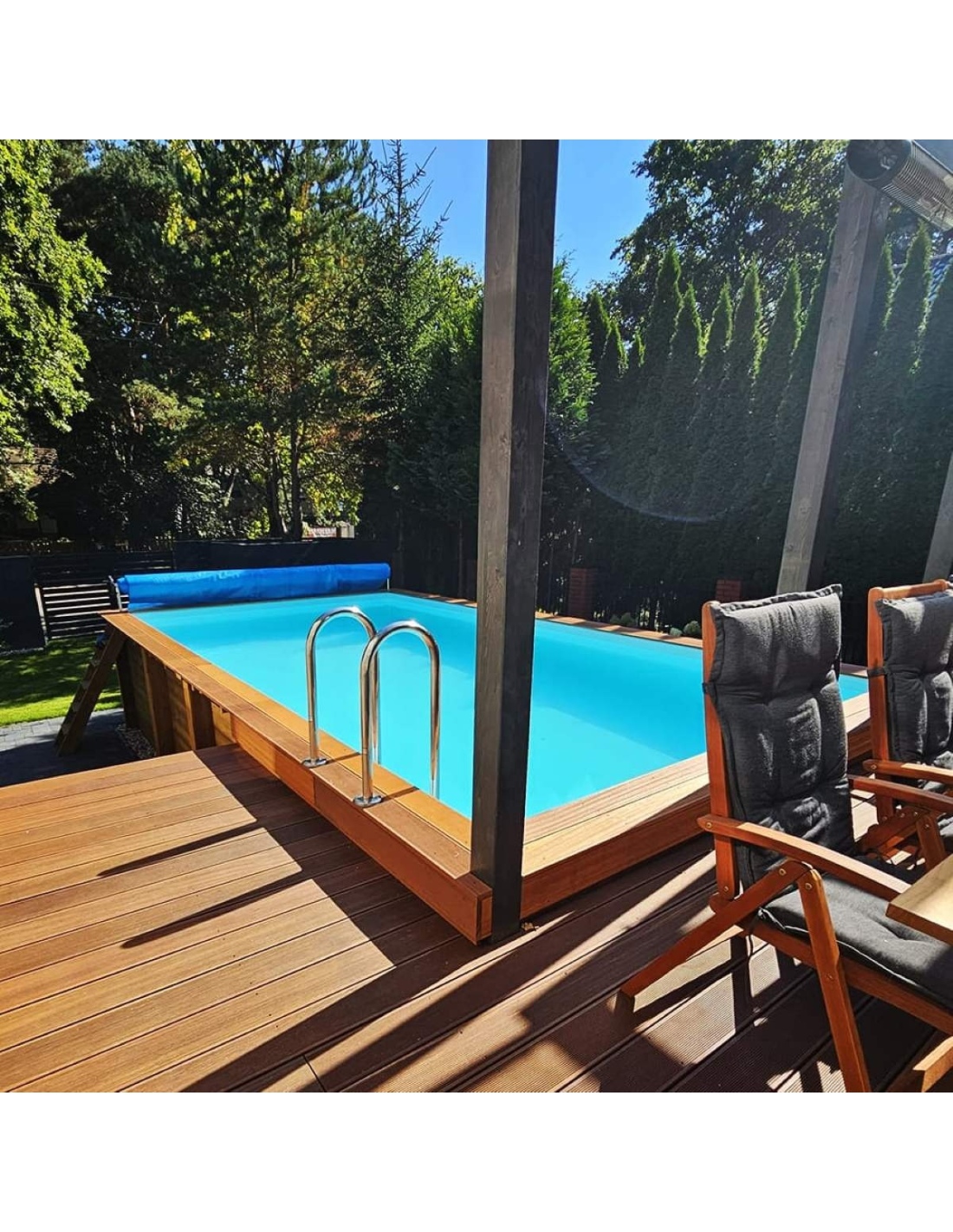 Der Pool besteht aus imprägniertem Kiefernholz, das nicht nur optisch überzeugt, sondern dank des Imprägnierungsprozesses: