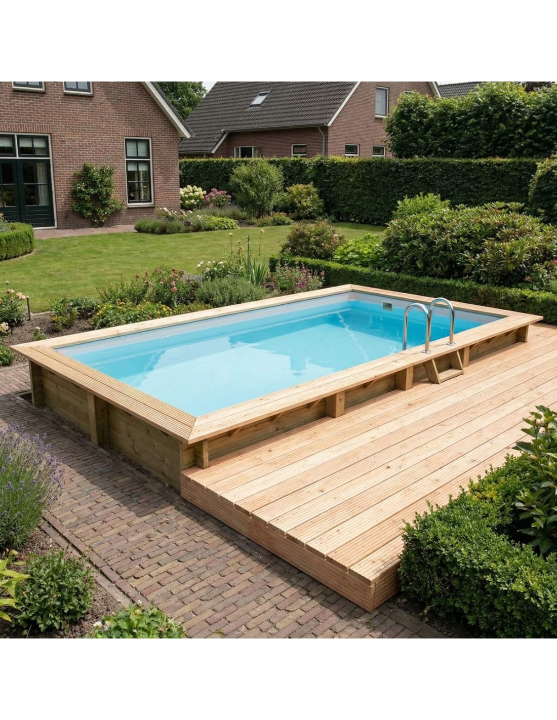 Holz verleiht der Umgebung einen eleganten und gemütlichen Charakter, und sein klassisches Erscheinungsbild sorgt dafür, dass sich der Pool harmonisch in jede Gartenart einfügt. Sie können Holzterrassen, Pflanzen oder dekorative Beleuchtung ergänzen, um eine besonders stimmungsvolle Atmosphäre zu schaffen.
