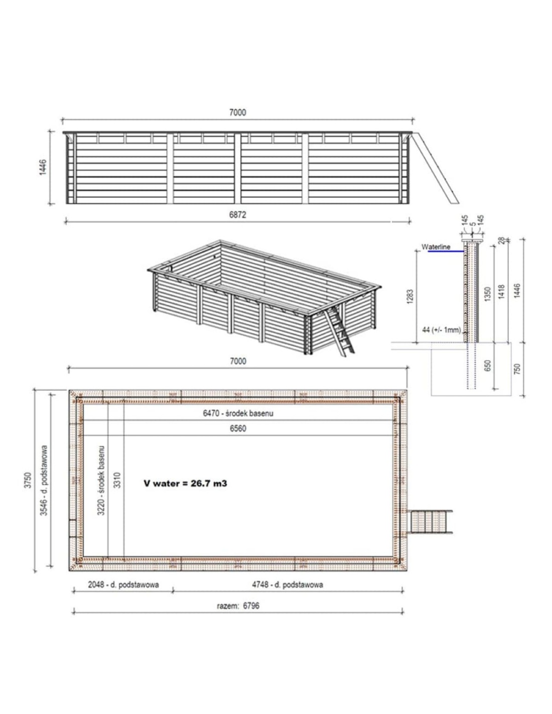 Holz-Gartenpool mit einem Volumen von 26.73 m³, gefertigt aus hochwertigem, imprägniertem skandinavischem Holz. Ideal für sommerliche Entspannung und Spiel im Garten.