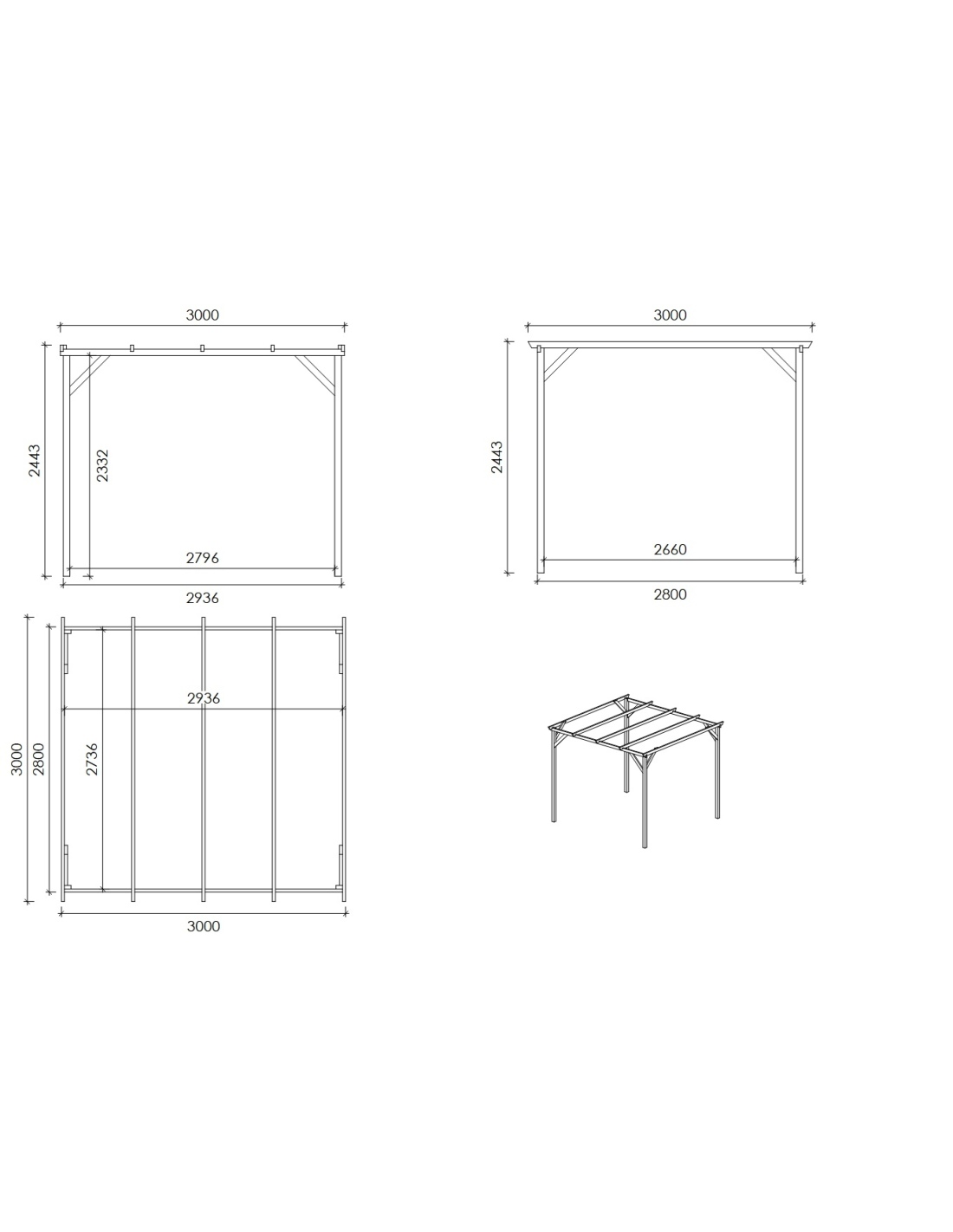 Die Fotos zeigen Holzcarport CAR12 mit der Breite von 3M und Tiefe von 3M. Höhe des Einfahrts beträgt M. Die maximale Dachlast beträgt 35 kg/m2 (einschließlich Dacheindeckung und Niederschlag, z. B. Schnee, Eis, Laub usw.)