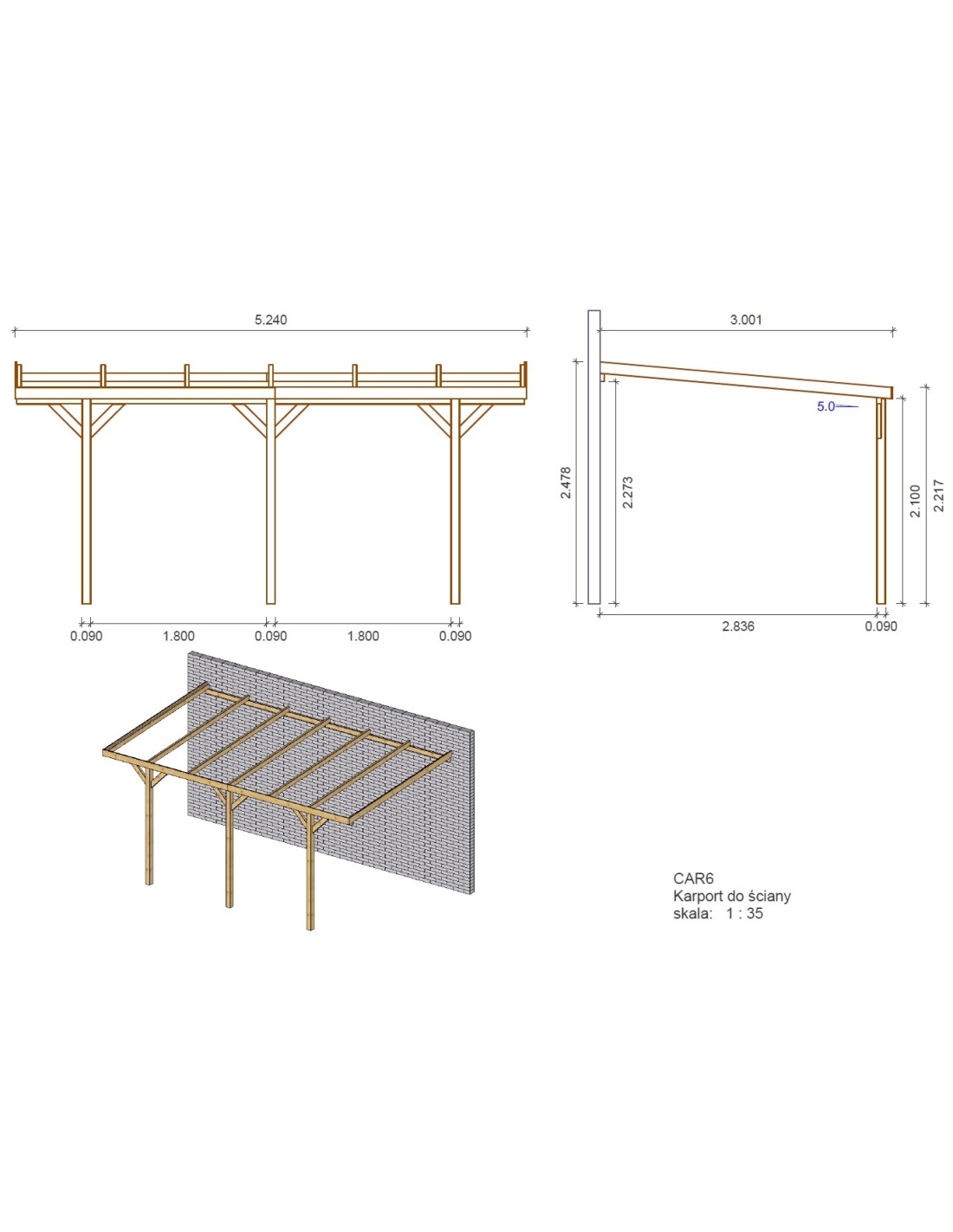 Die Fotos zeigen Holzcarport CAR6 mit der Breite von 3M und Tiefe von 5.24M. Höhe des Einfahrts beträgt 2.1M. Die maximale Dachlast beträgt 35 kg/m2 (einschließlich Dacheindeckung und Niederschlag, z. B. Schnee, Eis, Laub usw.)
