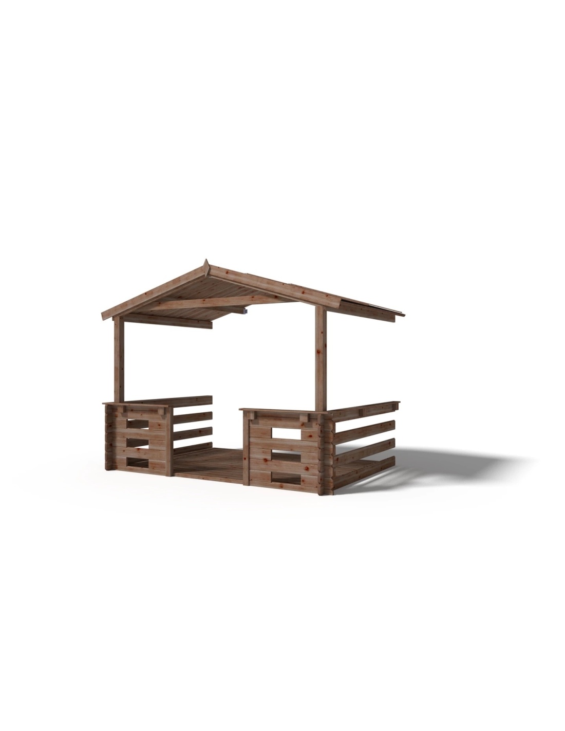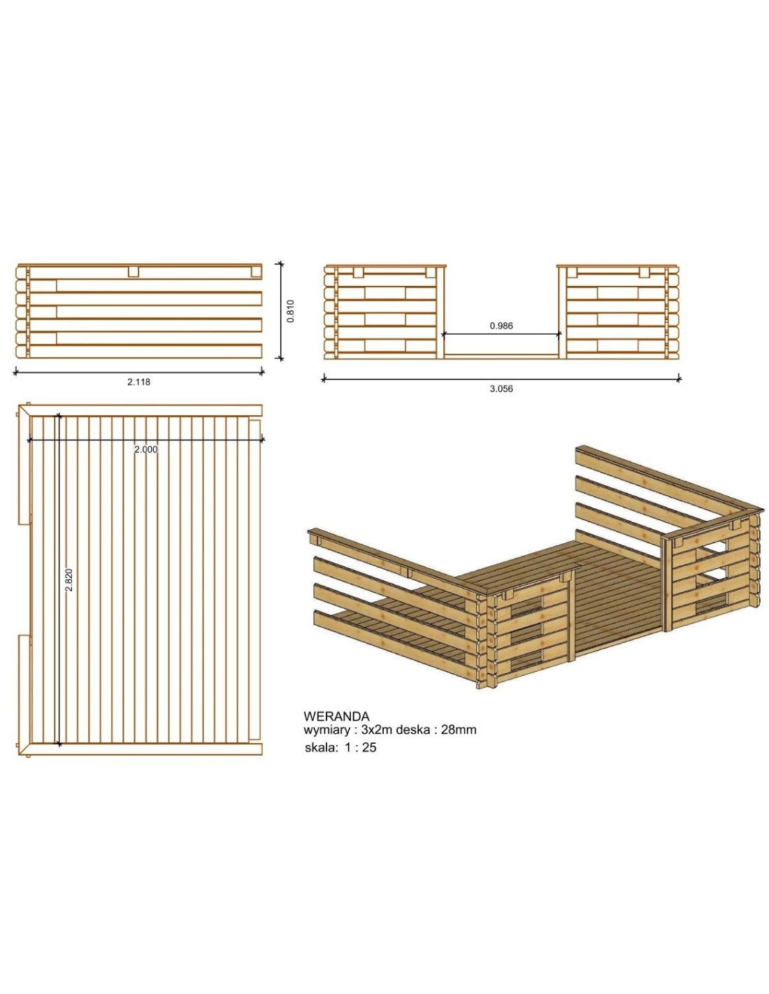 Holzterrasse DOM147 mit einer Fläche von 6 m2, einer Breite von 3 m und einer Tiefe von 2 m. Die Veranda passt zu den Holzgartenhäuschen mit einer Frontbreite von 3 m i nd einer Dicke von 28 mm, die von ALTANKA p.s.a. angeboten werden. Die Montage gemäß der beigefügten Anleitung bereitet keine größeren Schwierigkeiten.