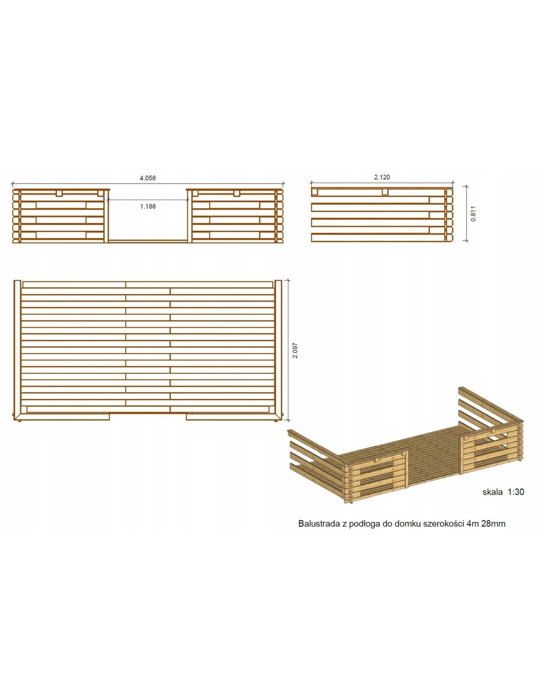 Holzterrasse DOM18 mit einer Fläche von 8 m2, einer Breite von 4 m und einer Tiefe von 2 m. Die Veranda passt zu den Holzgartenhäuschen mit einer Frontbreite von 4 m i nd einer Dicke von 28 mm, die von ALTANKA p.s.a. angeboten werden. Die Montage gemäß der beigefügten Anleitung bereitet keine größeren Schwierigkeiten.
