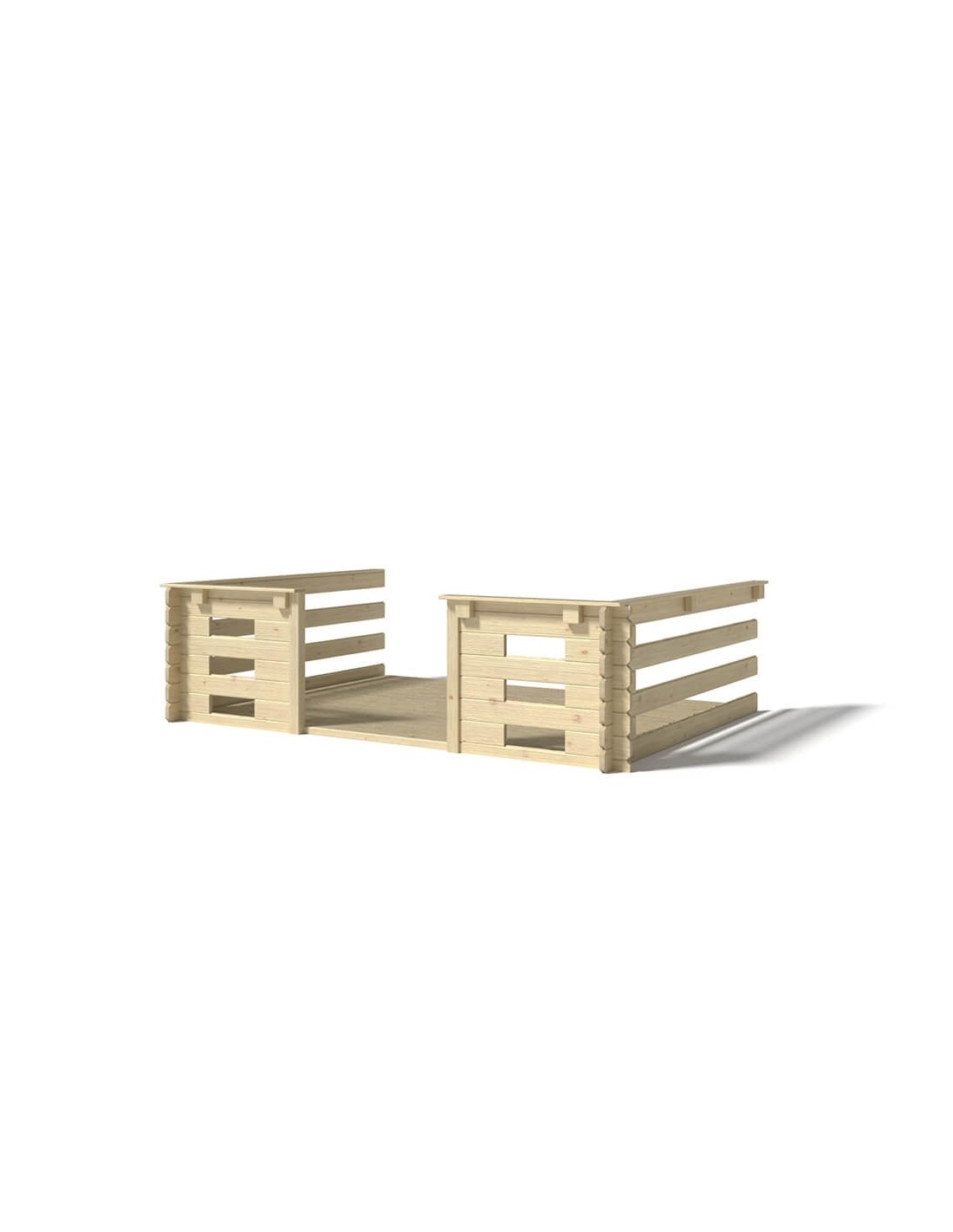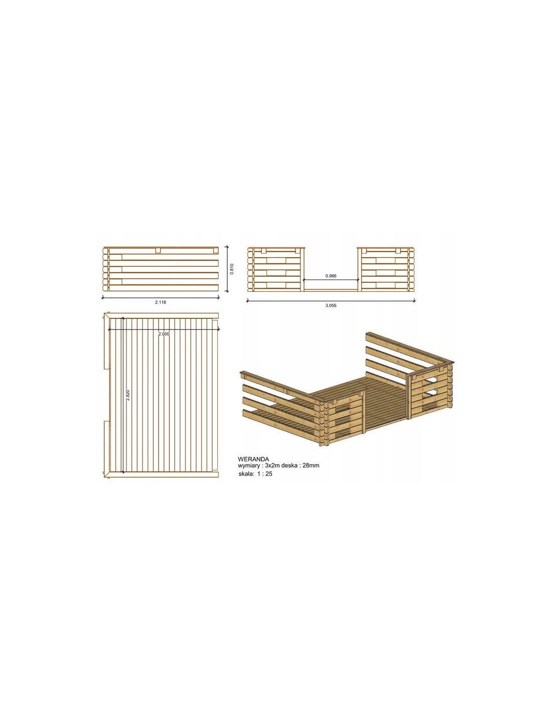 Holzterrasse DOM142 mit einer Fläche von 6 m2, einer Breite von 3 m und einer Tiefe von 2 m. Die Veranda passt zu den Holzgartenhäuschen mit einer Frontbreite von 3 m i nd einer Dicke von 28 mm, die von ALTANKA p.s.a. angeboten werden. Die Montage gemäß der beigefügten Anleitung bereitet keine größeren Schwierigkeiten.