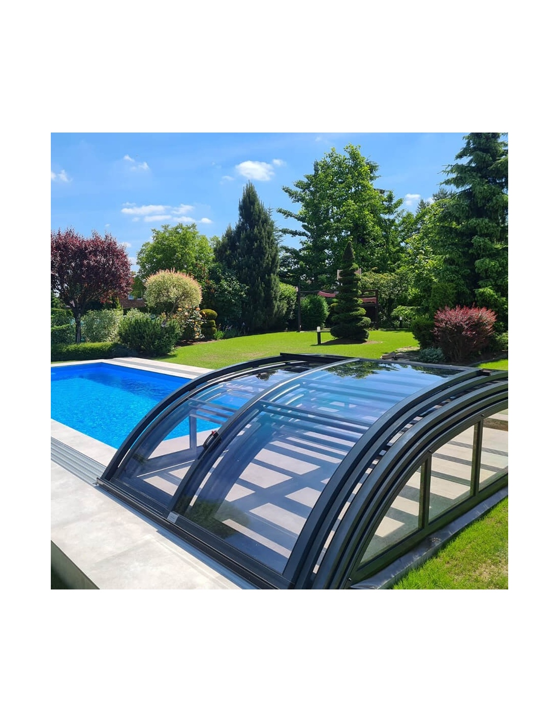 Dank der Überdachungen Horizon können Sie Ihren Garten-Außenpool mehrere Monate im Jahr genießen. Mit zusätzlicher Wassererwärmung kann die Saison vom späten Frühling bis zum frühen Herbst andauern. Die Wassertemperatur in einem überdachten Pool ist um einige Grad höher! Ein Pool im Garten ist ein Ort voller Freude, Entspannung und Treffen mit Freunden – verlängern Sie die Badesaison!