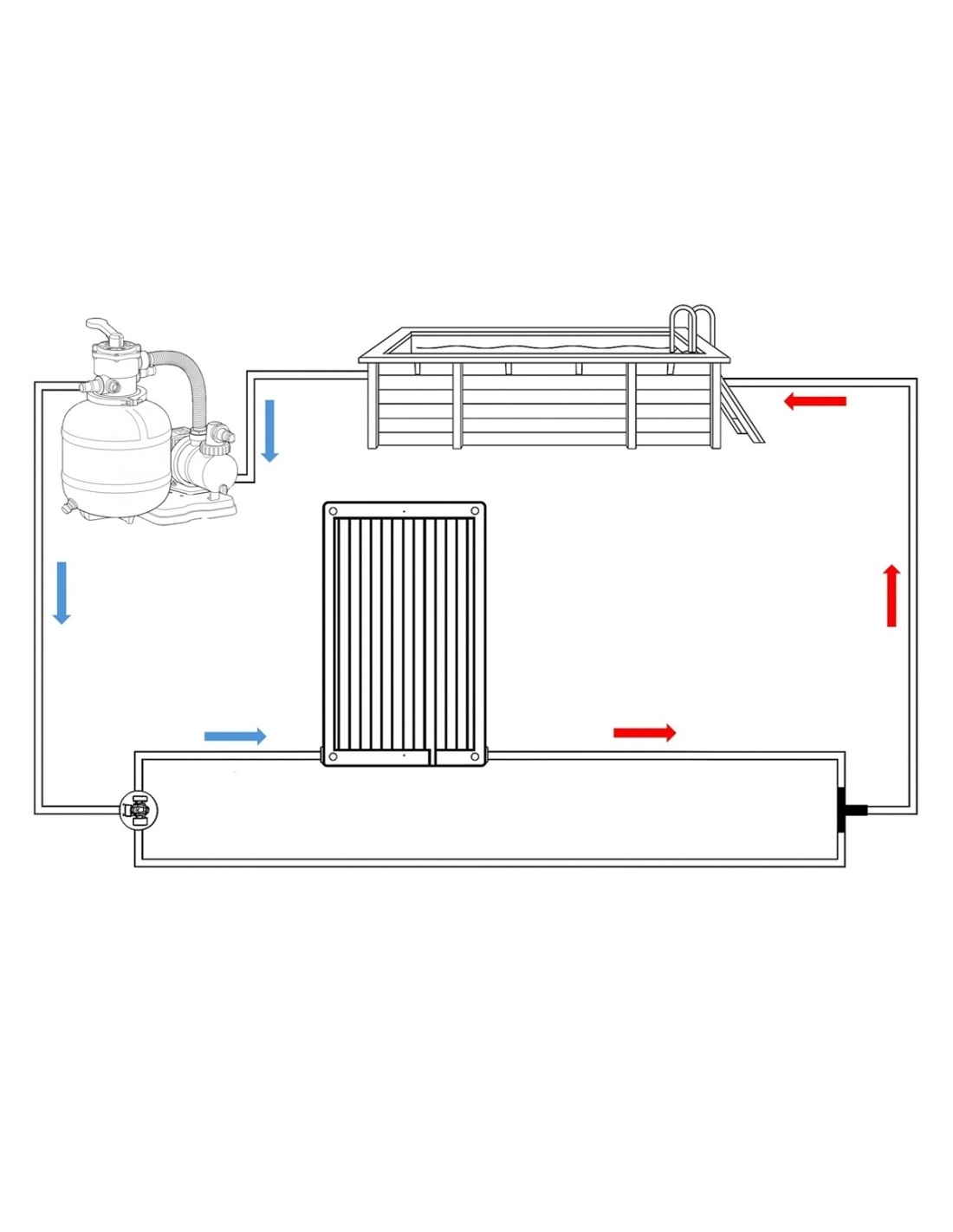 Das Wasser aus dem Filtersystem fließt durch die Kammern des Kollektors, wo es durch Sonnenstrahlen erwärmt wird, und kehrt dann in den Pool zurück. Das Bypass-Ventil ermöglicht eine Durchflusskontrolle: bei Sonnenschein wird das Wasser durch den Kollektor geleitet, bei schlechtem Wetter wird die Anlage umgangen.