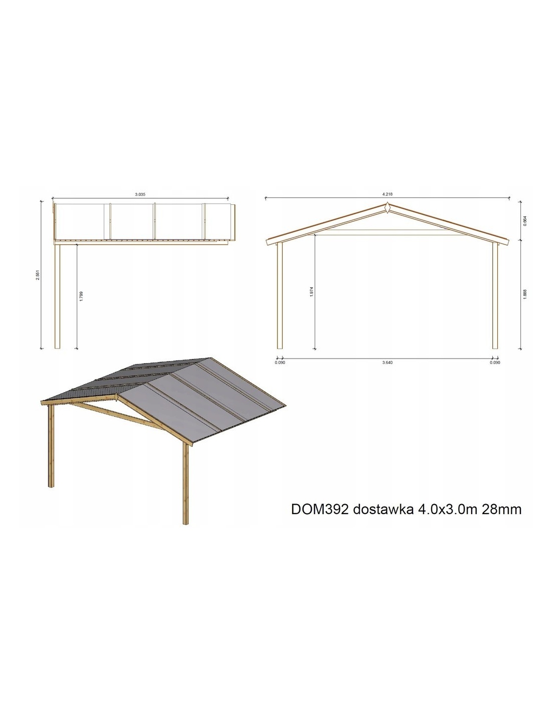 Das angebotene Dach eignet sich perfekt als Abdeckung gegen sengende Sonne, Regen, Schnee, Hagel oder andere Niederschläge, mit einer vorderen Breite von 4 m und einer Tiefe von 3 m (Fläche: 12 m2). Das Dach passt zu Gartenhäusern aus Holz mit Satteldach und einer Frontbreite von 4 m die aus 28 mm dicken Brettern gefertigt sind und in unserem Geschäft erhältlich sind.